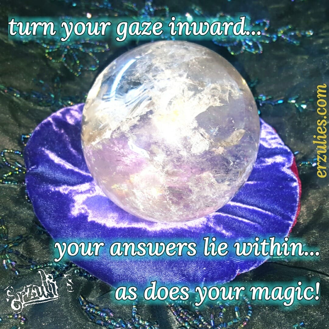 Posted Nov. 2017 ~ Sharing with you my magnificent, magical crystal ball, just in love with it’s vibrancy and movement. This was gifted to me over 20+ years ago for the grand opening of Erzulie’s Authentic Voodoo, by the legendary Richard Moffitt, one of my mentors (of the famed Mystic Curio shop on Rue Royal for 40+ years…may he rest in peace). I am a huge fan of scrying techniques, as it not only allows for clarity, spiritual and psychic attunement but also pulls up your own deeper subconscious and unresolved inner issues by forcing you to see into the mind’s eye and dealing with the hidden energies. It’s a powerful tool for both divination and contemplation, profound awareness and guidance. For those seeking answers to deeper issues, emotional struggles, roots of behavioral patterns or self sabatoging tendencies, I share with you this precious crystal ball to turn your gaze inward, connect to self and spirit and discover your magic within!